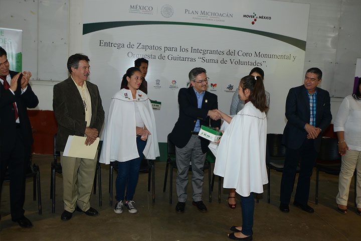 NOTICIAS 26/06/2015Entregan zapatos al Coro Monumental y Orquesta Suma de VoluntadesEl Gobierno municipal hace equipo con las autoridades federales y estatales, para trabajar en el mismo objetivo: alejar a los jóvenes y niños de la violencia y acompañarlos en sus pasos, hacia el desarrollo y formación como ciudadanos responsables y gente de bien.