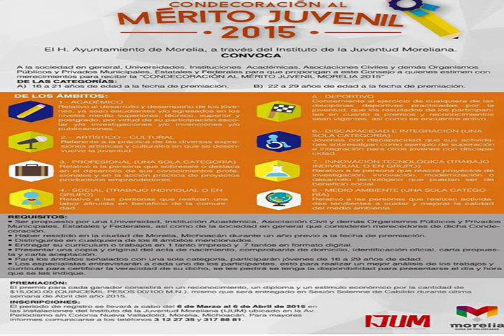 NOTICIAS 31/03/2015Abren periodo para entregar propuestas al Premio al Mérito Juvenil 2015Con la finalidad de reconocer el esfuerzo y talento de jóvenes morelianos que han destacado en el ámbito artístico-cultural, académico, deportivo, profesional, social, innovación tecnológica, medio ambiente, así como discapacidad e integración, se hará entrega de la Condecoración al Mérito Juvenil 2015.