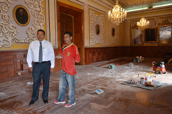 NOTICIAS 27/01/2015Supervisa Wilfrido obras en la Sala de Cabildo El Presidente Wilfrido Lázaro Medina supervisó los trabajos de rehabilitación del piso de madera que se realizan en la Sala de Cabildo del Palacio Municipal, que forma parte del paquete de obras que se realizan en el histórico edificio con recursos federales por el orden de 1 millón 500 mil pesos.