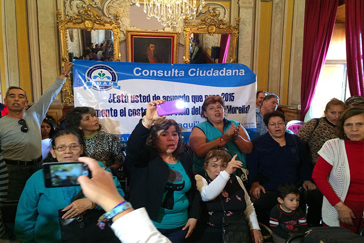 Integrantes de la Asociación de Usuarios del Agua de Morelia (AUAM), se manifiestan en este momento en plena sesión ordinaria del ayuntamiento de Morelia, con la finalidad de que se les tome en cuenta la consulta ciudadana que se realizó este fin de semana para saber si los morelianos están de acuerdo con el aumento al agua.