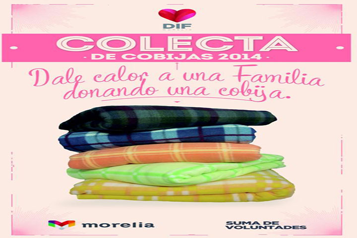 NOTICIAS 29/10/2014Arrancará DIF Morelia colecta de cobijasCon el propósito de brindar y compartir calor con quienes más lo necesitan, el Ayuntamiento de Morelia a través del DIF Municipal que preside la Sra. Maggy Oribio de Lázaro, arrancará este jueves 30 de octubre la Tercera Colecta de Cobijas "Dale calor a una familia, donando una cobija".