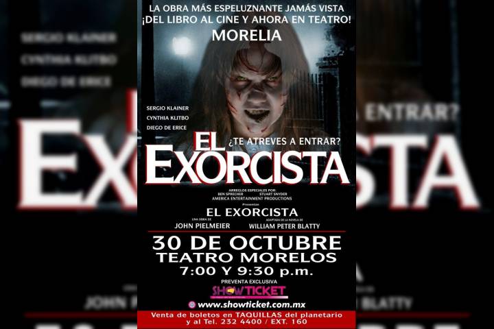 NOTICIAS 30/10/2019Hoy, "El Exorcista" aterrorizará MoreliaLa historia de "El Exorcista", vendrá a Morelia para ofrecer dos funciones en el Teatro Morelos: 19:00 horas y 21:30 horas, este miércoles 30 de octubre.
