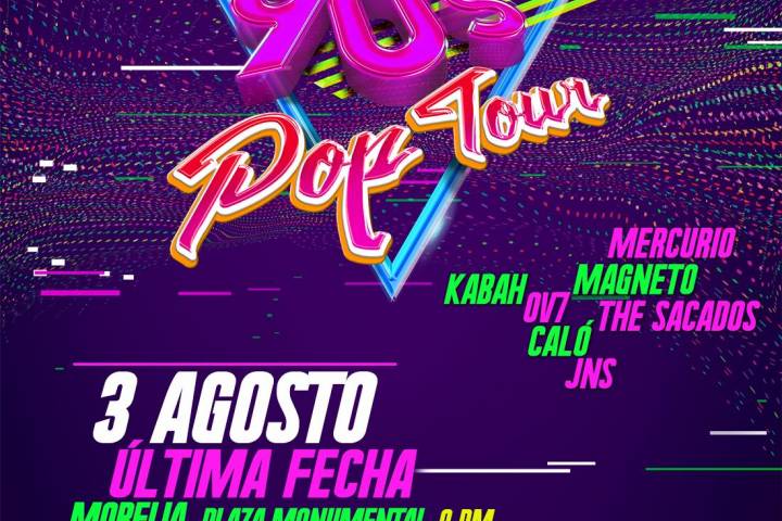 NOTICIAS 03/08/2019Llega esta noche el 90s Pop Tour a Morelia La noche de este sábado, el 90s Pop Tour ofrecerá una noche mágica llena de recuerdos, nostalgia, baile, y un viaje musical a través de OV7, Kabah, JNS, Magneto, Mercurio, Caló y The Sacados, a partir de las 9:00 PM en la Plaza Monumental de Morelia.