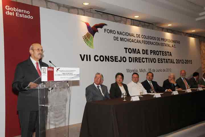 NOTICIAS 06/06/2012Pide Fausto al Colegio de Profesionistas coadyuvar en la elaboración de proyectos ejecutivosEn el marco de la toma de protesta del séptimo consejo directivo del Foro Nacional de Colegios de Profesionistas del estado, el gobernador Fausto Vallejo Figueroa, pidió a los estudiosos su solidaridad y les manifestó que es necesario intensificar el compromiso por Michoacán, que está por encima de intereses particulares.