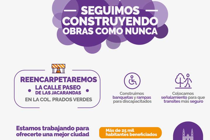 NOTICIAS 19/02/2018Este martes, Gobierno Municipal inicia reencarpetamiento de importante calle en Prados Verdes Con la consigna de seguir interviniendo las vialidades más transitadas por la ciudadanía y que presentan un notable deterioro tras años sin mantenimiento, el Ayuntamiento de Morelia arrancará este martes el Reencarpetamiento de la calle Paseo de las Jacarandas, en la Colonia Prados Verdes.