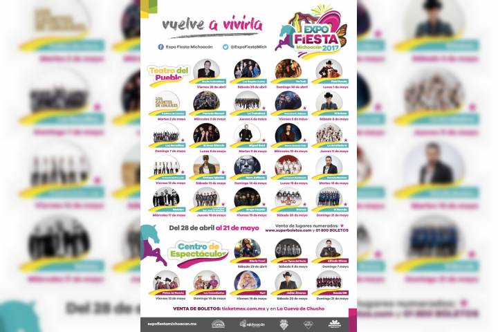 NOTICIAS 09/04/2017Artistas internacionales en el mejor elenco en la historia de la Expo Fiesta Michoacán La Expo Fiesta Michoacán 2017 contará con la presencia de artistas de talla nacional e internacional como parte de la cartelera del Teatro Del Pueblo, siendo éste el mejor elenco en la historia de este evento.
