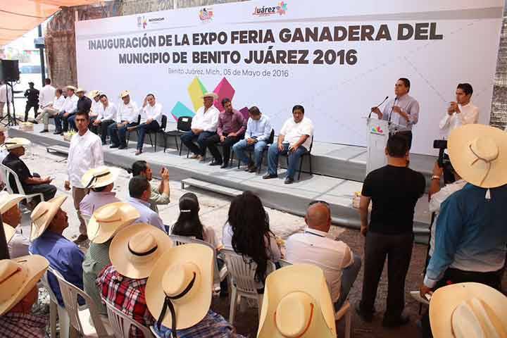 NOTICIAS 05/05/2016Habrá apoyo para Benito Juárez y la región en producción ganadera y frutícola: SilvanoCon la decisión de apoyar a Benito Juárez y los municipios de esta región en la consolidación del proyecto de una procesadora de guayaba, y en el relanzamiento de la ganadería, que es de buena calidad en esta zona, el Gobernador del Estado, Silvano Aureoles Conejo, inauguró la Expo Ganadera Juárez 2016.