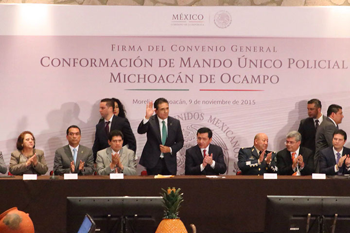 NOTICIAS 09/11/2015Se firma el Mando Único en Michoacán Se firmó el convenio entre el Estado y los municipios de Michoacán, donde queda la conformación de Mando Único Policial, del que fue testigo le secretario de Gobernación, Miguel Ángel Osorio Chong.