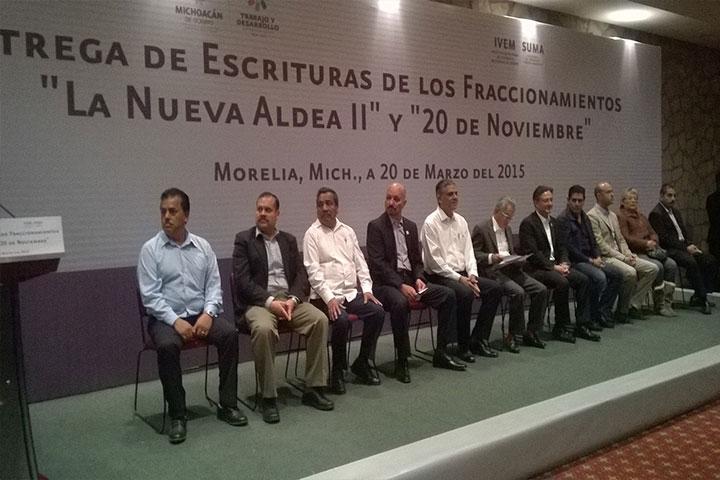NOTICIAS 20/03/2015Pide Jara acelerar los procesos de escrituración Se realizó la entrega de escrituras de 300 lotes de los Fraccionamientos "La Nueva Aldea II y 20 de Noviembre" esto a integrantes del Sindicato de Trabajadores al Servicio del Poder Ejecutivo (Staspe) en Michoacán por parte de autoridades estatales.