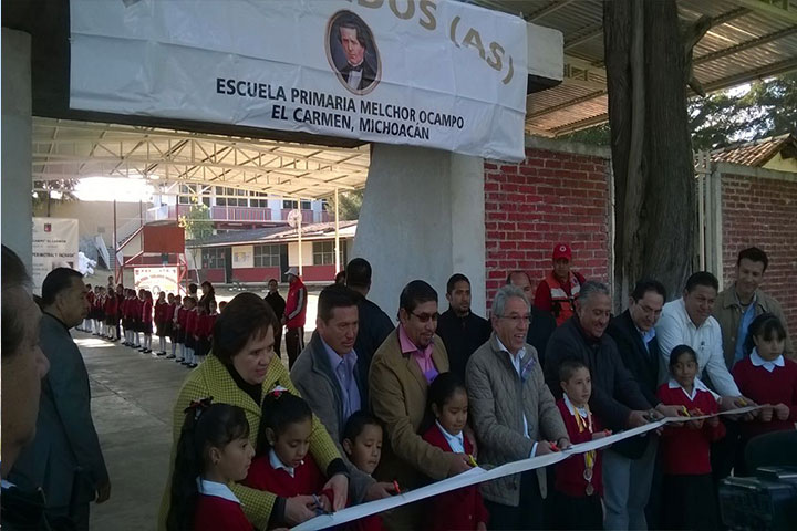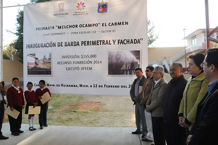 Inauguró el gobernador sustituto, Salvador Jara Guerrero, obras en beneficio de la escuela primaria "Melchor Ocampo", en la comunidad El Carmen, en Huiramba con un costo de 355 mil pesos de FONREGIÓN 2014.