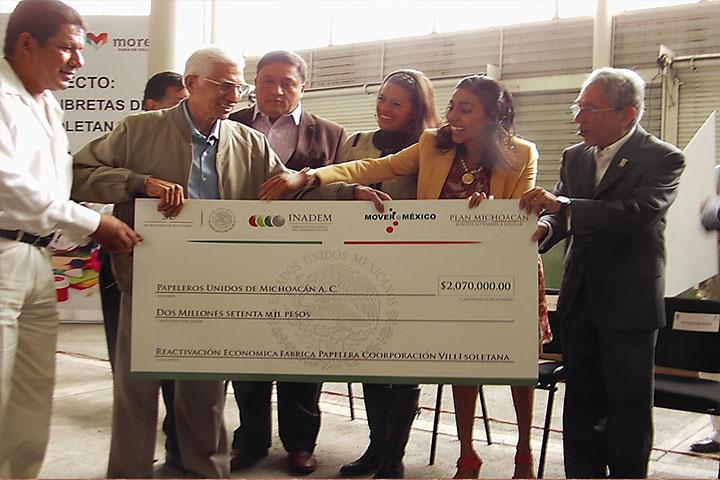 NOTICIAS 15/08/2014Entregan recursos a papeleros para reactivación de fábrica de libretasPara fomentar el desarrollo económico de microempresarios locales y como parte del apoyo a proyectos productivos dentro del Plan Michoacán, el gobernador Salvador Jara Guerrero, y autoridades federales, entregaron más de 3 millones de pesos procedentes de la Federación y el municipio, para la reactivación de la fábrica de libretas de Corporación Vallisoletana.
