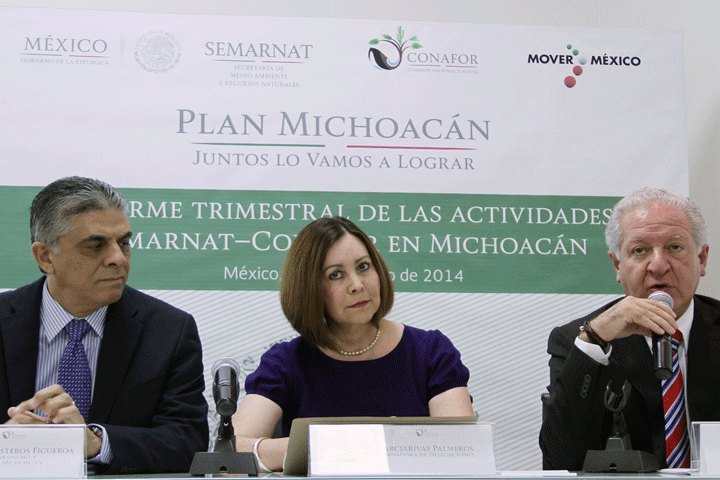 NOTICIAS 07/06/2014Se cumplen acciones ambientales del Plan Michoacán.La Titular de la Unidad Coordinadora de Delegaciones de la SEMARNAT y enlace de la dependencia para el Plan Michoacán, Martha Garciarivas Palmeros, informó sobre las acciones que han llevado a cabo la dependencia federal y la Comisión Nacional Forestal en el estado de Michoacán durante el primer trimestre del Plan Michoacán, presentado por el Presidente Enrique Peña Nieto en febrero pasado con el objetivo de restablecer las bases del desarr... Ver más...