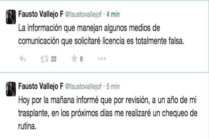 Mediante su cuenta de Twitter, @FaustoVallejoF, rechazó tajantemente haber hecho dicha solicitud.