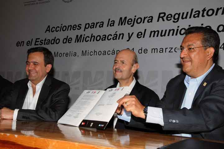 En el Ejecutivo estatal estamos determinados en hacer de Michoacán un estado más competitivo, tarea en la que participamos corresponsablemente los tres órdenes de gobierno, quienes coordinadamente estamos creando un ambiente legal moderno, ágil y propicio para atraer nuevas inversiones, aseveró el gobernador Fausto Vallejo Figueroa al fungir junto con el secretario de Economía, Ildefonso Guajardo Villareal, como testigo de honor de firma ... Ver más...