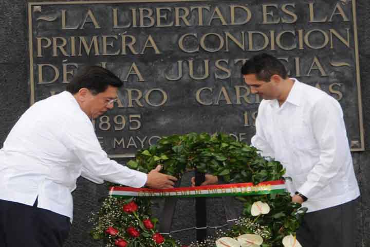 Al iniciar esta tarde los festejos en ocasión del 199 aniversario de la promulgación de la Constitución de Apatzingán de 1814, el gobernador Jesús Reyna García colocó una ofrenda floral y montó guardia de honor ante el monumento al general Lázaro Cárdenas del Río.