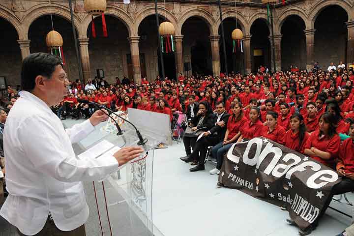 Ante más de mil jóvenes que este día asumieron su compromiso de aportar a Michoacán al llevar el servicio educativo a las comunidades más alejadas del estado, el gobernador Jesús Reyna García reiteró que en congruencia con la responsabilidad de otorgar una educación de calidad, la administración estatal aplicará las innovaciones de la Reforma Educativa para alcanzar un mejor lugar a nivel nacional en los indicadores de este rubro.