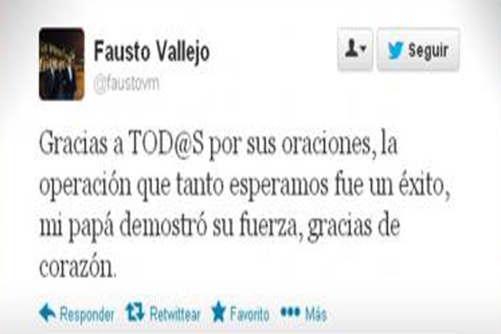 Su primogénito, Fausto Vallejo Mora, escribió está tarde a las 17:25 horas un primer tuit en el que agradece por las oraciones e informa que la operación a la que fue sometido el mandatario resulto ser un éxito.