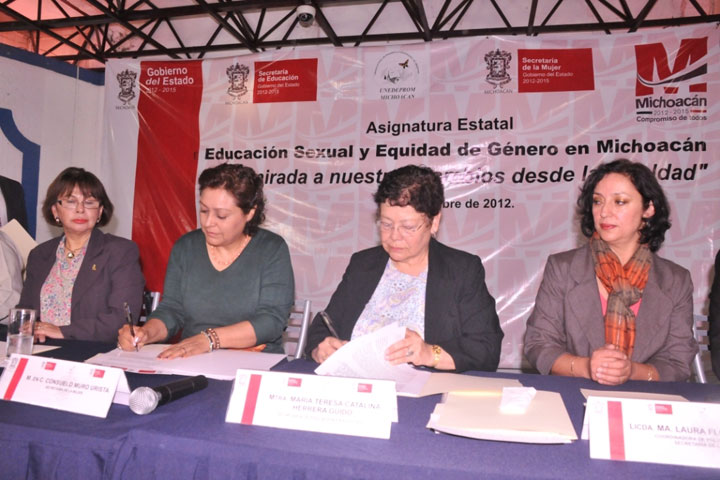 NOTICIAS 12/09/2012Arranca asignatura de Sexualidad y Equidad de géneroMichoacán se ubica como uno de los estados pioneros a nivel nacional en implementar una asignatura de Sexualidad y Equidad de Género para primero de secundaria, tras el arranque formal de dicha materia en la entidad, por parte de la Secretaría de Educación en el Estado (SEE) y de la Secretaría de la Mujer (SEMUJER).