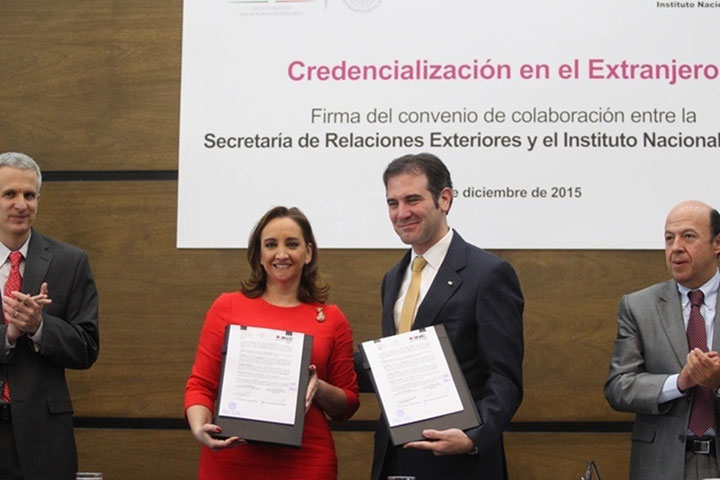 NOTICIAS 17/12/2015Acuerdan credencialización de mexicanos en el extranjero en febreroCon la omisión de informar el costo que tendrá sólo el envío de la credencial de elector a los connacionales que así la soliciten y que radican en el extranjero, de nueve dólares, el Consejero Presidente del INE, Lorenzo Córdova Vianello y Claudio Ruiz Massieu, firmaron el convenio de colaboración para que a partir del mes de febrero se empiecen a expedir las primeras micas a los más de 11.9 millones de mexicanos viven fuera del país.
