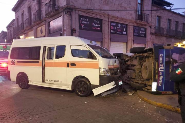 Durante la mañana de este miércoles se registró un choque entre dos combis y una de ellas terminó volcada, esto en el Centro Histórico de Morelia.