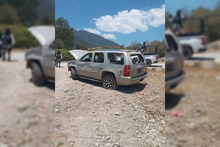 Elementos de la Guardia Civil, Guardia Nacional y Policía Municipal, localizaron una camioneta con manchas de sangres e impactos de bala, en las inmediaciones de la comunidad Tacario.