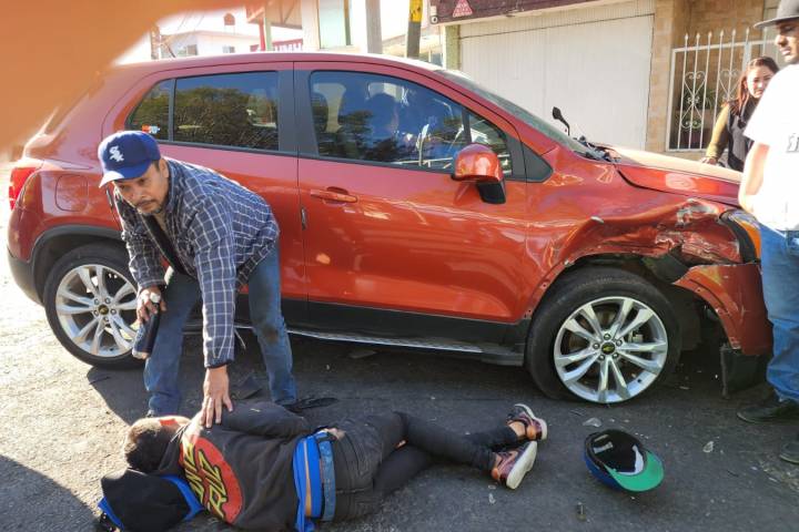 Un muchacho resultó con fractura de fémur y golpes en otras partes del cuerpo al impactar su motocicleta contra una camioneta, cuya conductora espero en el sitio a las autoridades policíacas.