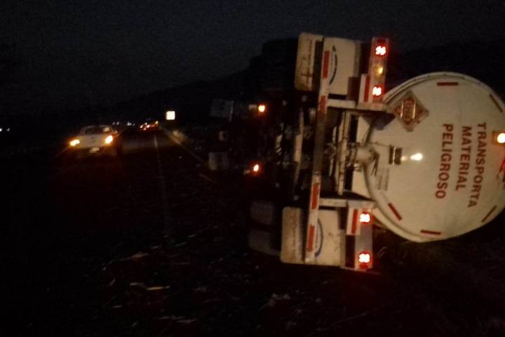 Una pipa cargada de destilado se volcó en la carretera Uruapan-Nueva Italia, situación que movilizó a los cuerpos de socorro y la Guardia Nacional.