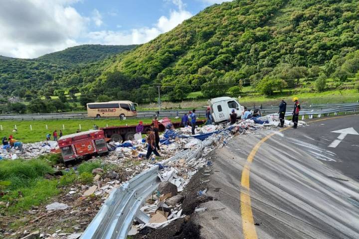 El aparatoso accidente tuvo lugar en el kilómetro 0+000 de la carretera de cuota Pátzcuaro ? Cuitzeo, donde un tractocamión doblemente articulado tras una pendiente pronunciada y debido al peso de la carga terminó por fuera d... Ver más...