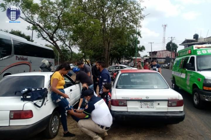 NOTICIAS 04/06/2022Atienden a 4 personas, tras choque de 2 taxisDos personas adultas y dos menores, que viajaban a bordo de un taxi, fueron atendidas por paramédicos del Cuerpo de Rescate, tras registrarse un accidente automovilístico, en el entronque de la salida a Pátzcuaro y el Libramiento de esta ciudad.