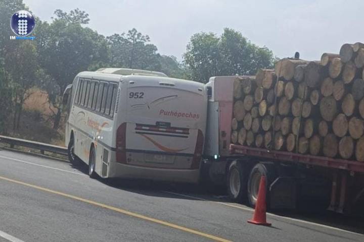La mañana de este jueves se registró un choque entre un camión de pasajeros y un camión cargado de madera, esto en el tramo Pátzcuaro -Uruapan, kilómetro 90+500 de la autopista Siglo XXI.