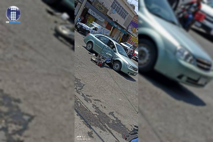 Un choque en el que se vieron involucrados una motocicleta y un automóvil compacto tuvo como consecuencia que una pareja que viajaba en la primera unidad en mención resultará lesionada.