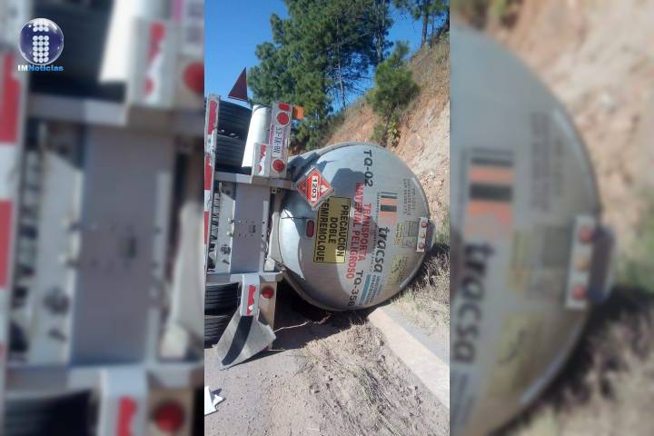 El accidente se registró en las inmediaciones del kilometro 6+500, donde la pipa se desprendió del tractocamión y terminó volcada sobre su costado derecho, a unos metros de las instalaciones de Petróleos Mexicanos en esta ciudad de Uruapan.