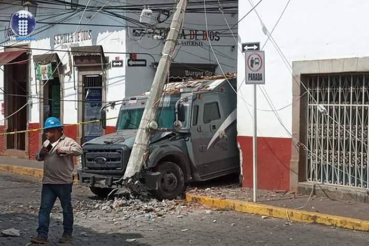 Un camión de valores que se salió de control en el Centro de Tacámbaro, derribó un poste de concreto para cableado de la Comisión Federal de Electricidad (CFE)