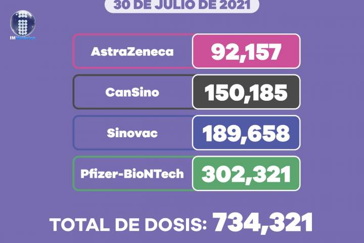 De estas, 20 mil 935 fueron a mujeres embarazadas, 101 mil 615 a docentes, 25 mil 438 a personal de salud; hasta la fecha, adultos mayores de 60 años han recibido un total de 734 mil 321 dosis de las vacunas de AstraZeneca, CanSino, Sinovac y Pfizer.