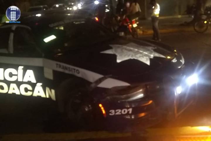 Un auto particular y una patrulla de la Policía Michoacán de Tránsito y Movilidad participaron en un choque sobre la avenida Acueducto de la ciudad de Morelia; un uniformado resultó levemente lastimado.