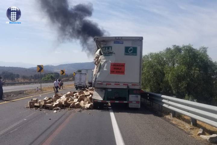 Dos tractocamiones, uno de ellos cargado con aguacates, participaron en un choque sobre la Autopista de Occidente, en el municipio de Zinapécuaro. Tras el impacto uno de los vehículos volcó y ardió en llamas; por fortuna no hubo heridos ni fallecidos, dijeron contactos policiales y de rescate.