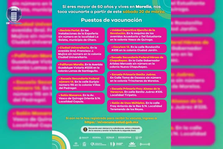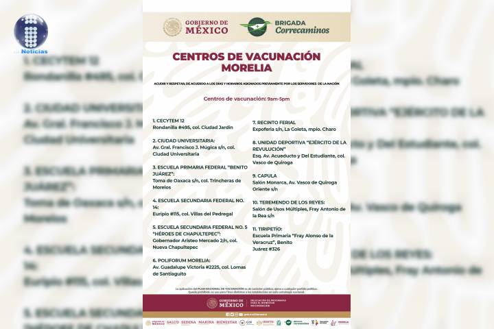 NOTICIAS 17/03/2021Tendrá Morelia 11 Centros de Vacunación contra COVID-19En un esfuerzo conjunto entre la SecretarÃa de Salud de Michoacán (SSM), la delegación de la SecretarÃa del Bienestar y el Ayuntamiento de Morelia, la capital del estado contará con 11 Centros de Vacunación contra COVID-19, a donde deberán acudir los adultos mayores de 60 años.