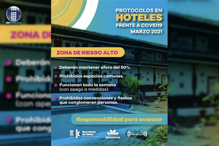 NOTICIAS 03/03/2021Hoteles deben operar con estrictas medidas de prevención ante el COVID-19Con el objetivo de lograr una apertura gradual del sector económico en Michoacán sin desatender las medidas contra el COVID-19, este mes los hoteles deberán cumplir de manera estricta los protocolos emitidos por las autoridades de salud.