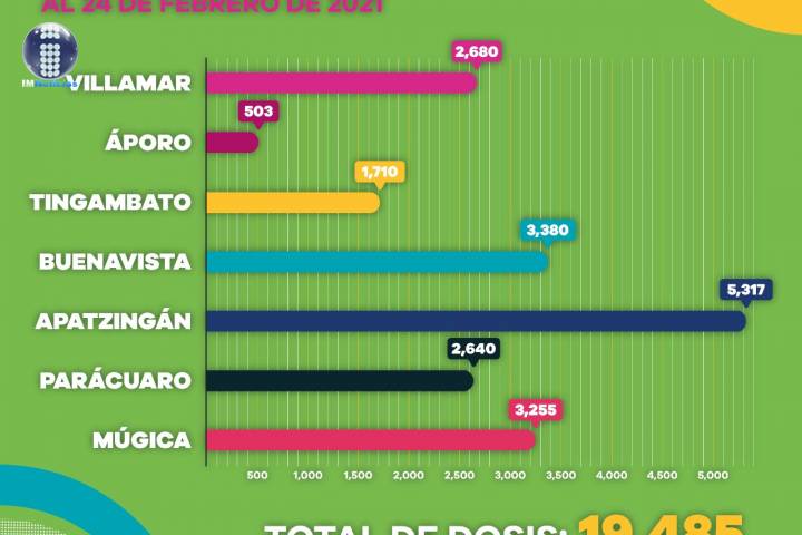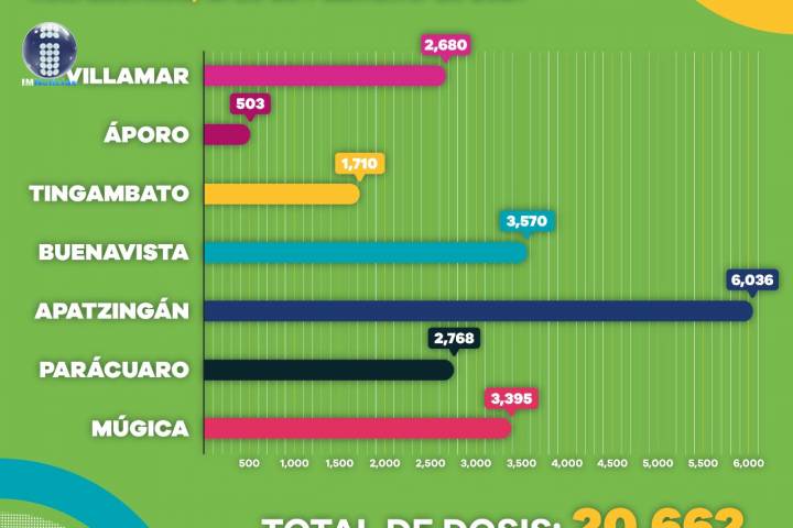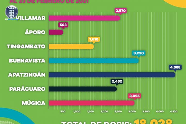 De las 18 mil 28 vacunas aplicadas, 2 mil 570 fueron en Villamar, 503 en Áporo, mil 610 en Tingambato, 3 mil 230 en Buenavista, 4 mil 568 en Apatzingán, 2 mil 452 en Parácuaro y 3 mil 95 en Múgica.