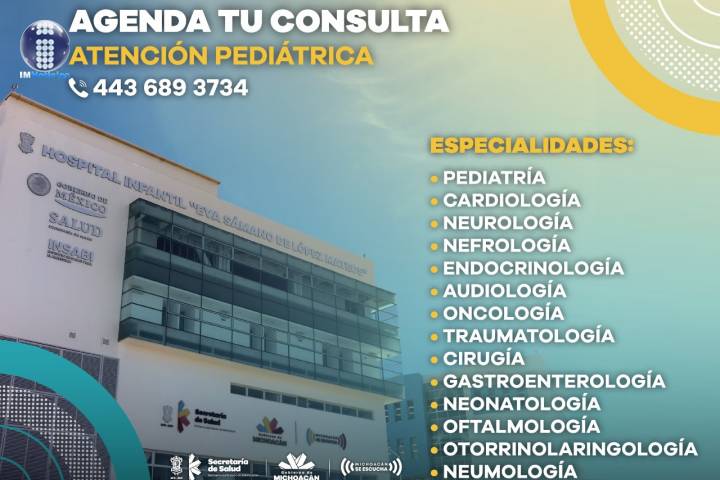 NOTICIAS 11/02/2021Dispone SSM de línea telefónica para programar citas en Hospital Infantil Las nuevas instalaciones del Hospital Infantil "Eva Sámano de López Mateos", en Ciudad Salud, ya se encuentran en funcionamiento, brindando servicios médicos de calidad a niñas, niños y jóvenes michoacanos.