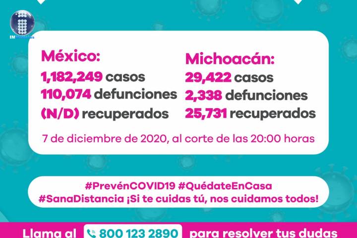 NOTICIAS 07/12/2020Acumula Michoacán 2 mil 338 defunciones por COVID-19 En la Unidad de Inteligencia Epidemiológica y Sanitaria (UIES), se han recibido un total de 70 mil 131 de enfermos de vías respiratorias a descartar coronavirus, 39 mil 213 cumplieron con definición operacional resultando negativas a COVID-19, es decir, no tienen el virus.