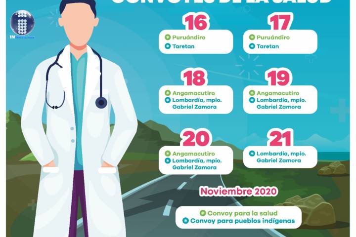 NOTICIAS 15/11/2020Convoyes de la Salud y Pueblos Indígenas estarán en cuatro municipios La Secretaría de Salud de Michoacán (SSM), informa a la población sobre los lugares en los que se encontrarán los Convoyes de Salud y de Pueblos Indígenas otorgando servicio gratuito, del 16 al 21 de noviembre.
