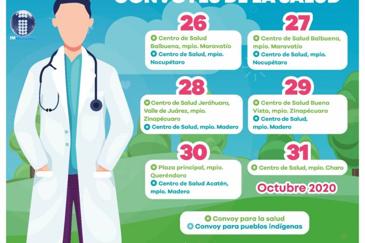 NOTICIAS 25/10/2020Serán atendidos 6 municipios a través de Convoyes de la SaludLa Secretaría de Salud de Michoacán (SSM), acercará servicios de salud gratuitos a 6 municipios a través de los Convoyes de Salud y de Pueblos Indígenas, del 26 al 31 de octubre.