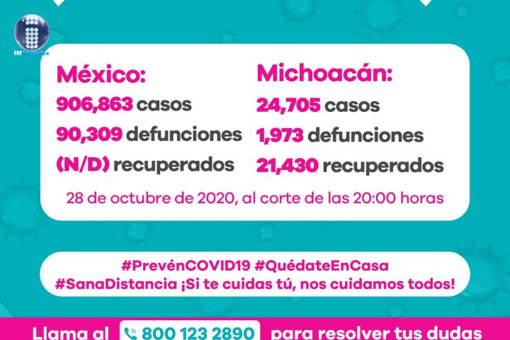 NOTICIAS 28/10/2020Son 1973 defunciones por COVID-19 en MichoacánEn la Unidad de Inteligencia Epidemiológica y Sanitaria (UIES), se han recibido un total de 59 mil 304 notificaciones de enfermos de vías respiratorias a descartar coronavirus, 33 mil 178 cumplieron con definición operacional resultando negativas a COVID-19, es decir, no tienen el virus.