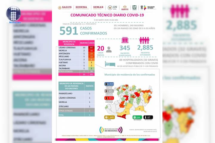 NOTICIAS 10/05/2020598 casos confirmados y 70 defunciones por COVID-19 en Michoacán