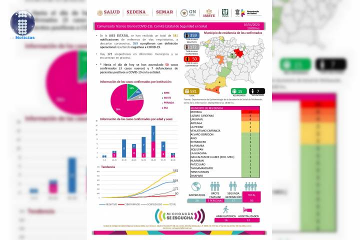 NOTICIAS 12/04/2020Suman 9 defunciones por COVID-19 en Michoacán En la UIES ESTATAL, se han recibido un total de 615 notificaciones de enfermos de vías respiratorias, a descartar coronavirus, 430 cumplieron con definición operacional resultando negativas a COVID-19.