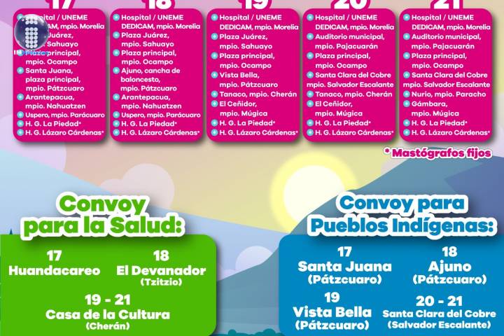 Es así, que los Convoyes de Mastografía, recorrerán los municipios de Morelia, Sahuayo, Pátzcuaro, Nahuatzen, Parácuaro, La Piedad, Lázaro Cárdenas, Cherán, Múgica, Pajacuar... Ver más...
