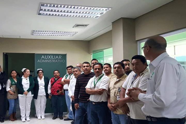 Este sábado, el M.D. Adrian Avellaneda, Delegado Estatal del ISSSTE acompañado del Dr. Roberto Flores Bautista, Secretario General de la Sección XXI del Sindicato Nacional del ISSSTE visitaron este fin de semana, la ClÃnica Hospital del Instituto en Lázaro Cárdenas para reunirse con trabajadores y derechohabientes.