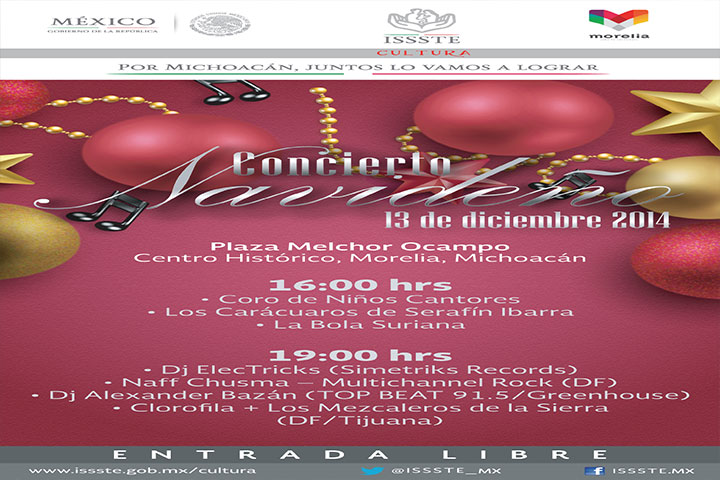 En la tarea de recuperar espacios públicos, como parte de las acciones del Plan Michoacán, la delegación del Instituto de Seguridad y Servicios Sociales de los Trabajadores del Estado (ISSSTE) en coordinación con el Gobierno estatal y el Ayuntamiento de Morelia han preparado, para el próximo sábado 13 de diciembre, una Carrera Atlética y un Concierto Navideño.