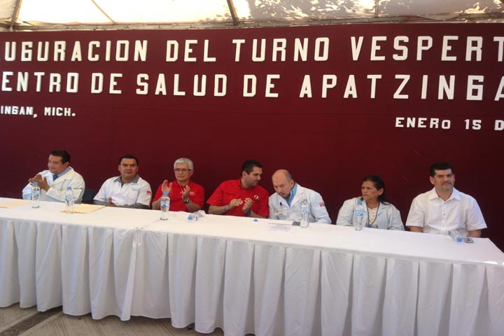 Con la intención de brindar un mejor servicio los 365 días del año a los habitantes del municipio de Apatzingán y sus alrededores, este martes el Centro de Salud de esta localidad abrió el turno vespertino, de tal manera que el Programa de Mejora que inició este año la Secretaría de Salud en Michoacán (SSM) arranca con buen ánimo y cumple uno de los compromisos hecho por el gobernador del Estado, Fausto Vallejo Figueroa.